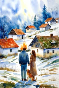 The village is asleep under its white quilt, red roofs glowing faintly like embers someone forgot to bank.